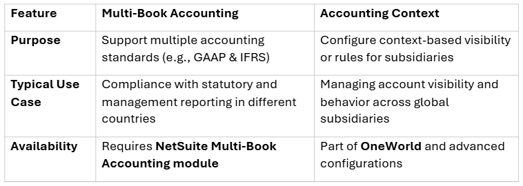 Accounting Contexts are more about segmenting account access and structure per subsidiary or country, often used in OneWorld implementations for statutory localization.