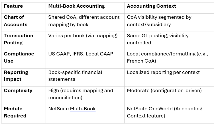 Managing the Chart of Accounts (CoA) in NetSuite requires a nuanced understanding when working in environments that use either Multi-Book Accounting or Accounting Contexts. While both features provide support for handling multiple financial standards or reporting structures, they do so in very different ways—with significant implications for how the CoA is managed, mapped, and used.