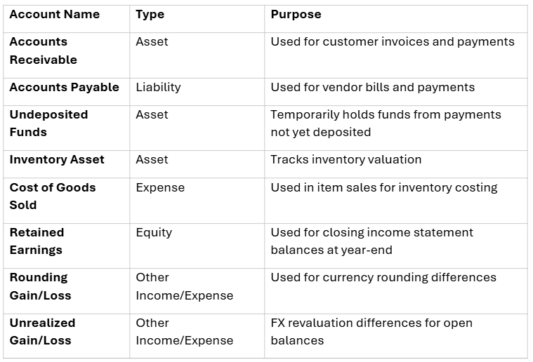 These accounts are required by NetSuite for core processes such as billing, receiving, inventory, and currency management. You should not modify or repurpose them for custom use.